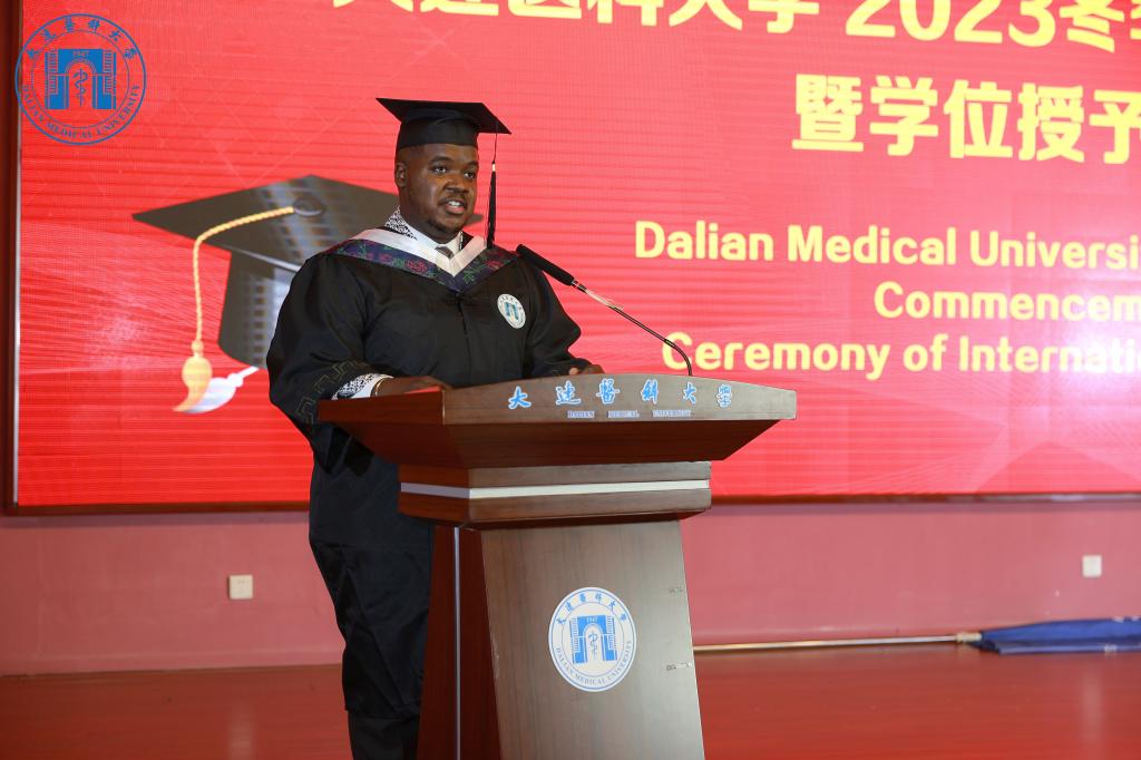 临床医学本科专业留学生马克代表毕业生发言,他对母校的培养表示感谢并表示今后会以大医校友身份继续发光发热,传承大医精神。随后,毕业生代表向辛勤培育、悉心指导他们的教师代表献花。在毕业典礼和导师大会间歇,毕业生还表演了精心准备的节目,表达了对母校的感谢和敬意。