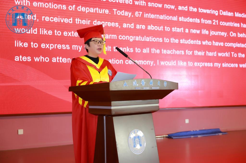 邵淑娟致辞,她代表学校对来自21个国家的67名国际学生顺利完成学业表示热烈祝贺并表达了殷切期望:“明仁、济世”,践行医者仁心的光荣使命;“甚解、敏行”,提升妙手丹心的精湛技艺;“开放、交流”,推动构建人类命运共同体。随后,卢苇宣读《2023届冬季国际学生学位授予决定》,校长赵杰分别为博士研究生、硕士研究生、本科毕业生拨穗并颁发毕业证书。