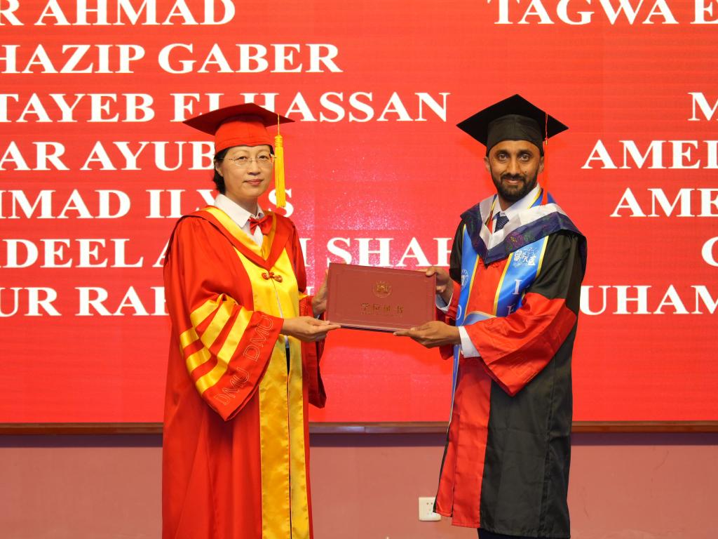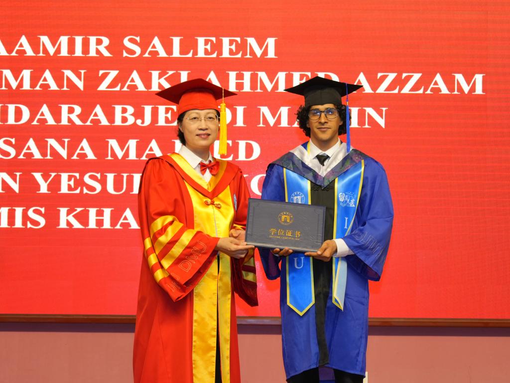 6月25日下午,大连医科大学2025届(夏季)国际学生毕业典礼暨学位授予仪式在图书馆一楼学术报告厅举行。来自38个国家和地区的117名国际学生毕业生齐聚一堂,共同庆祝他们在中国的学业圆满结束,开启人生新的征程。