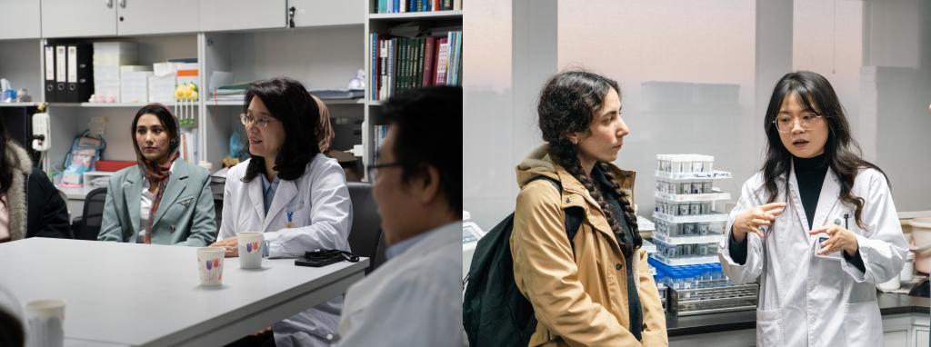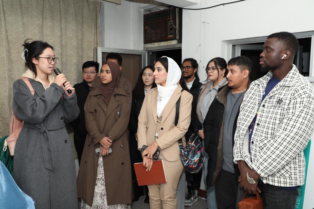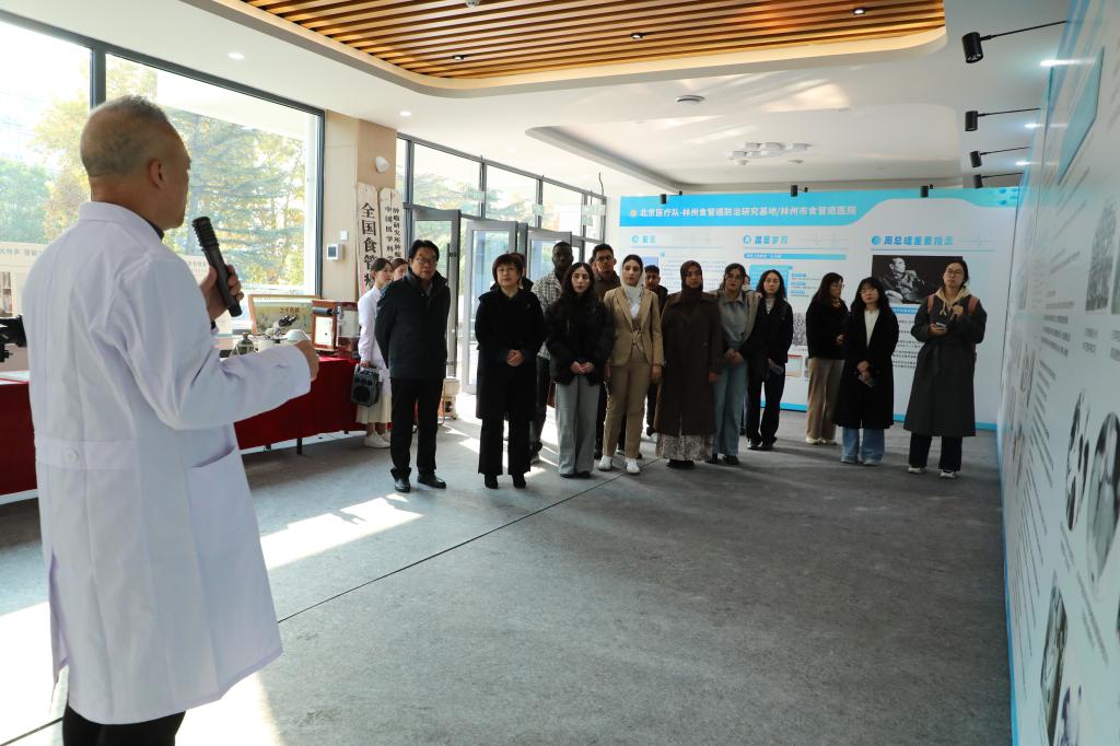 随后,留学生们前往林州食管癌防治研究基地,探访北京医疗队曾经工作和生活的旧址。门廊展板再现了这座小院从土坯房逐步改造为功能齐全研究基地的变迁历程。范金虎教授指着旧调查表、煤油灯等实物,向学生们讲述了医疗队当年如何凭借有限条件奠定中国食管癌研究基础的故事。留学生们还走进内镜室,了解高清内镜检查及分子检测等先进筛查技术。