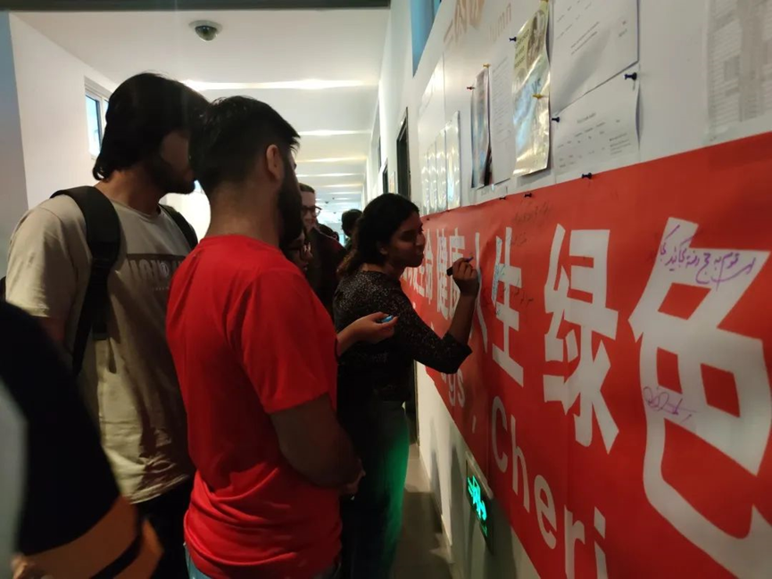 组织留学生在印有“远离毒品 珍爱生命 健康人生 绿色无毒”的条幅上进行签名活动。留学生踊跃地签上了自己的名字并留写了对于平安及健康的美好祝愿。